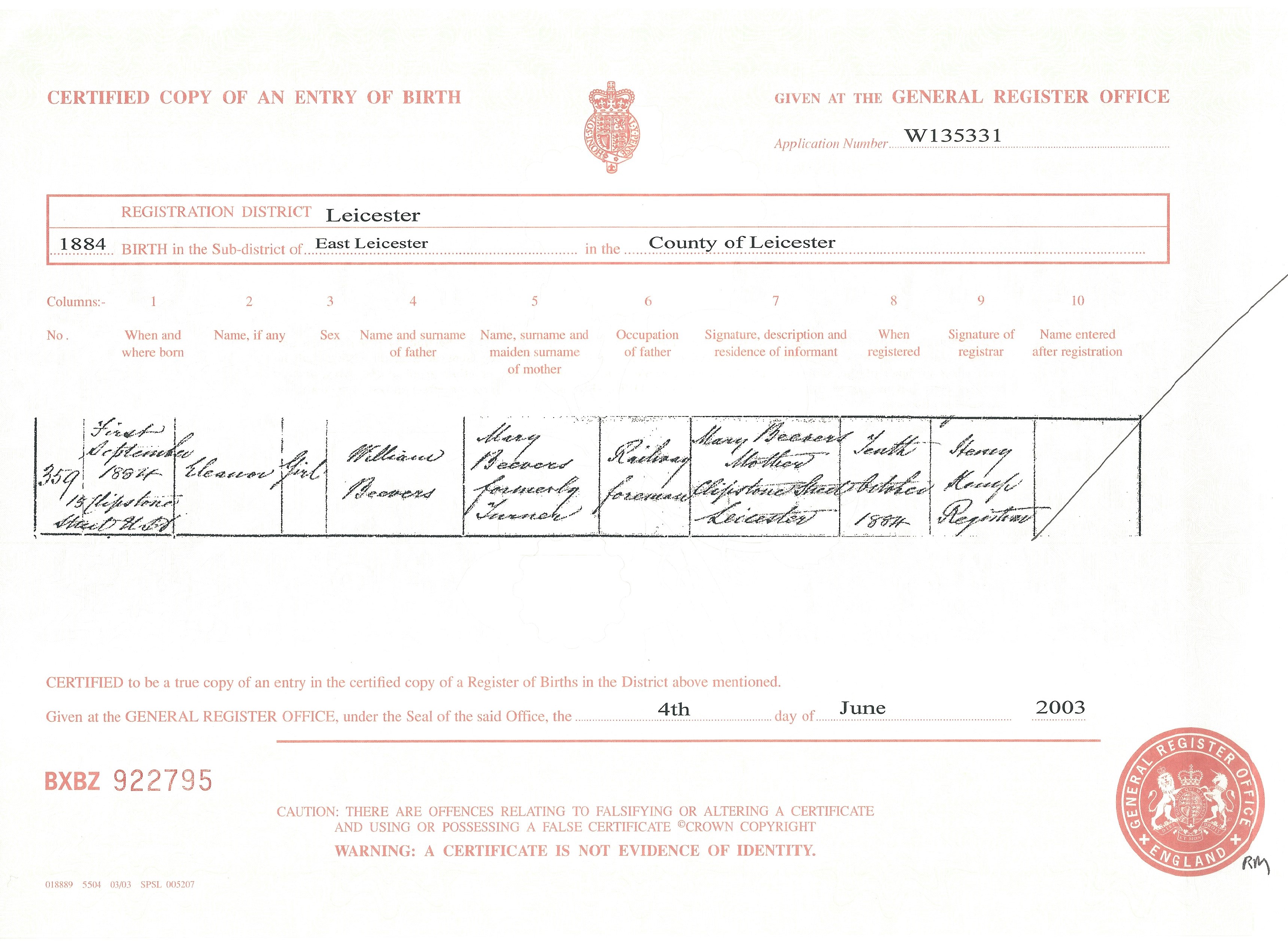 Eleanor BEEVERS was born in 1884 in Leicester, the third child of William and Mary BEEVERS.