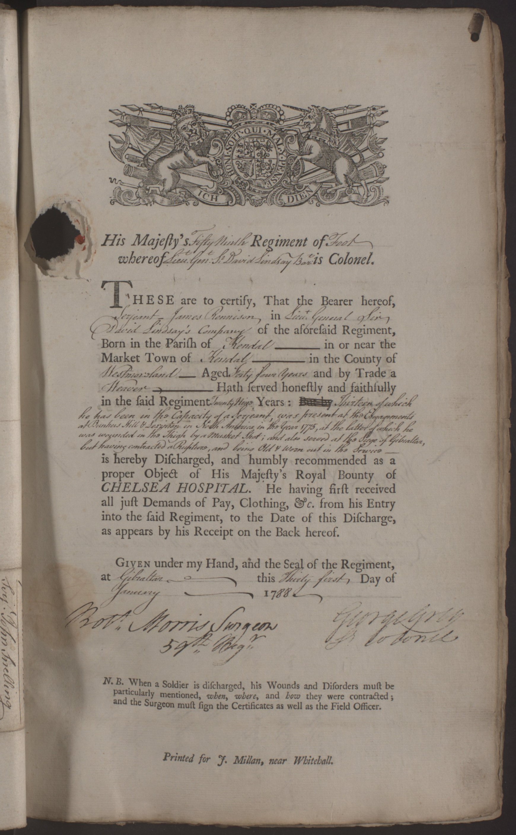 He served for 29 years - 13 years as a Serjeant - and was decommissioned from the 59th Regiment of Foot for health reasons in Gibraltar in 1788, and given a Chelsea Hospital pension. Aside from his thigh wound, he had suffered a "rupture".