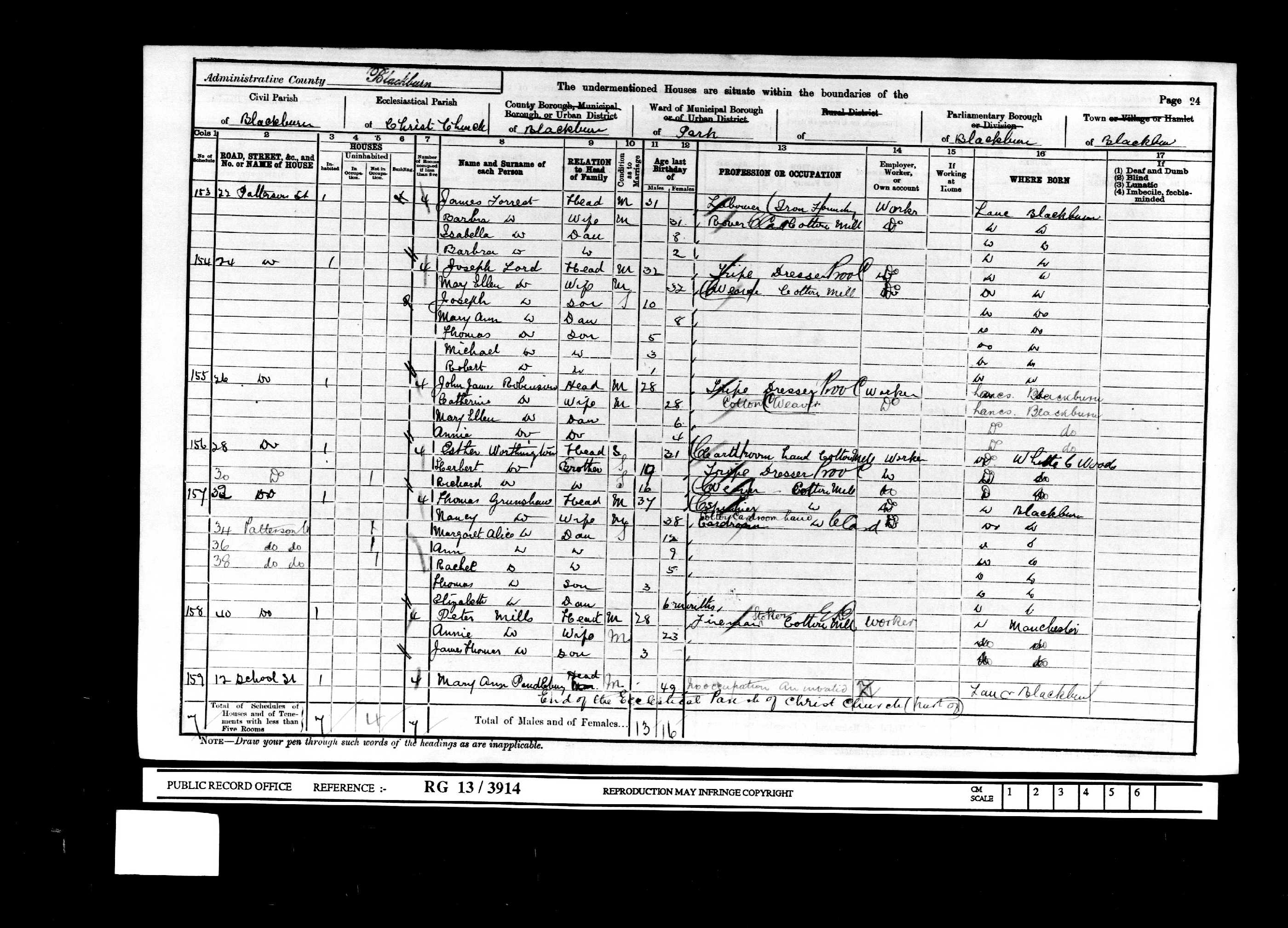 Barbara Forrest - Wife - M - 31 - Rover [?] Cotton Mill - Worker - Lancs Blackburn