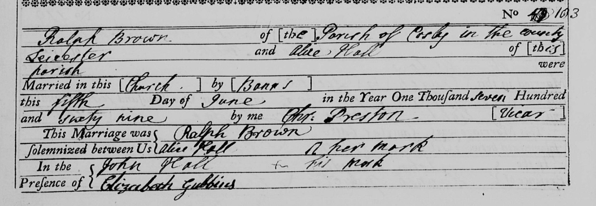 Alice HALL married Ralph BROWN in 1769 in Chilvers Coton which is 14 miles from Cosby (where Ralph came from) and 9 miles from MOnks Kirby (where Alice came from). Why they married there is a mystery.