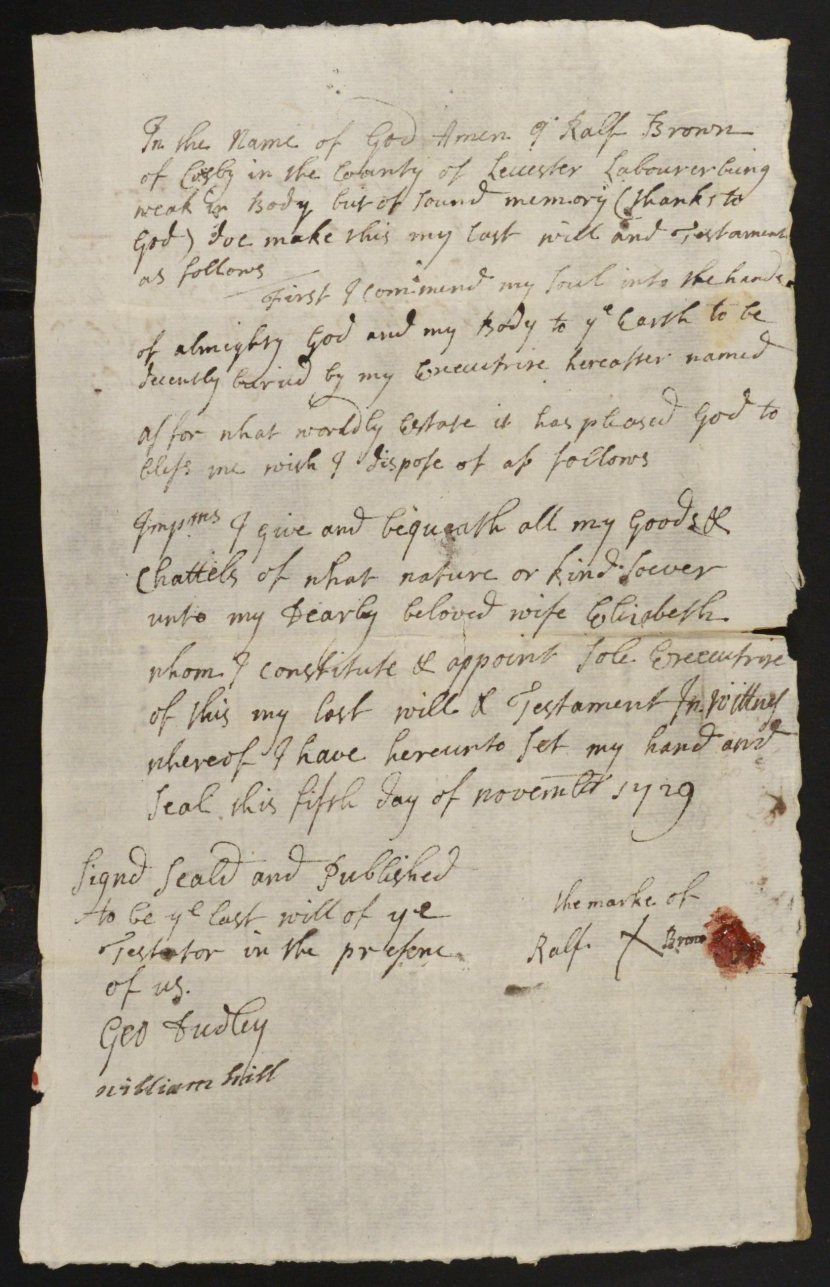 In the name of God Amen I Ralf Brown of Cosby in the County of Leicester Labourer being weak in Body but of sound memory (thanks to God) do make this my last will and testament as follows