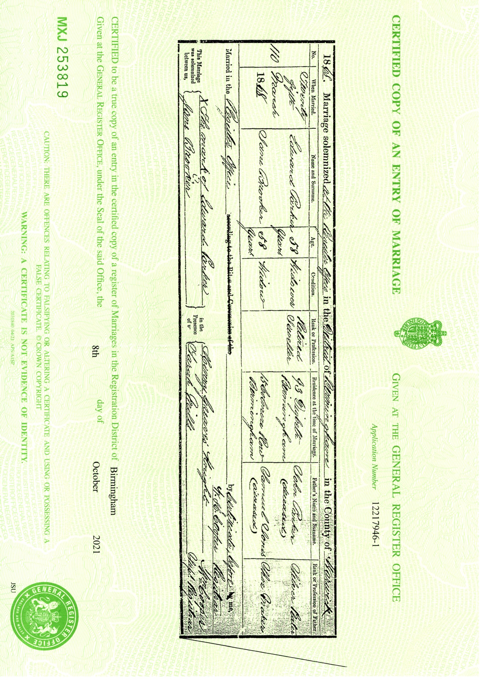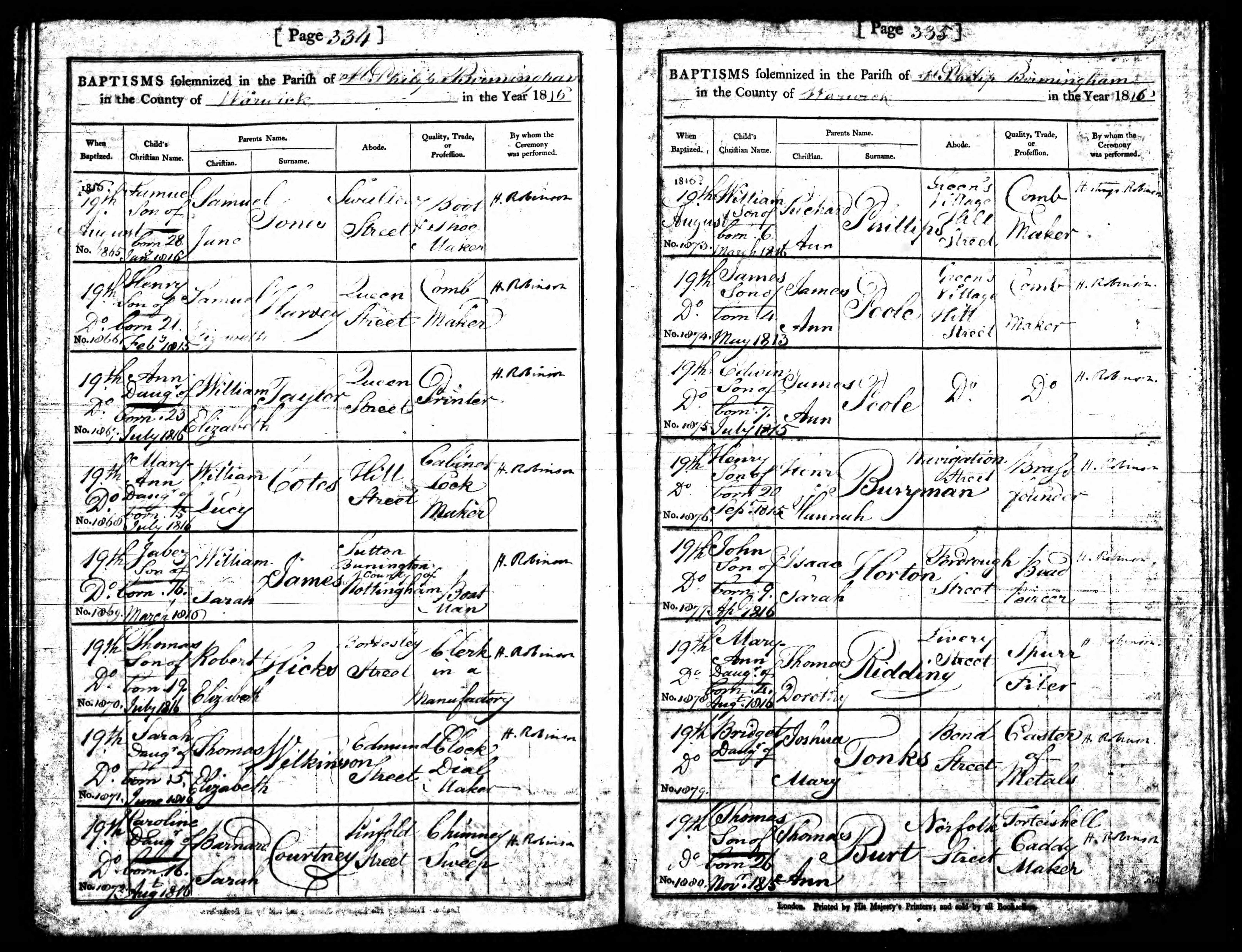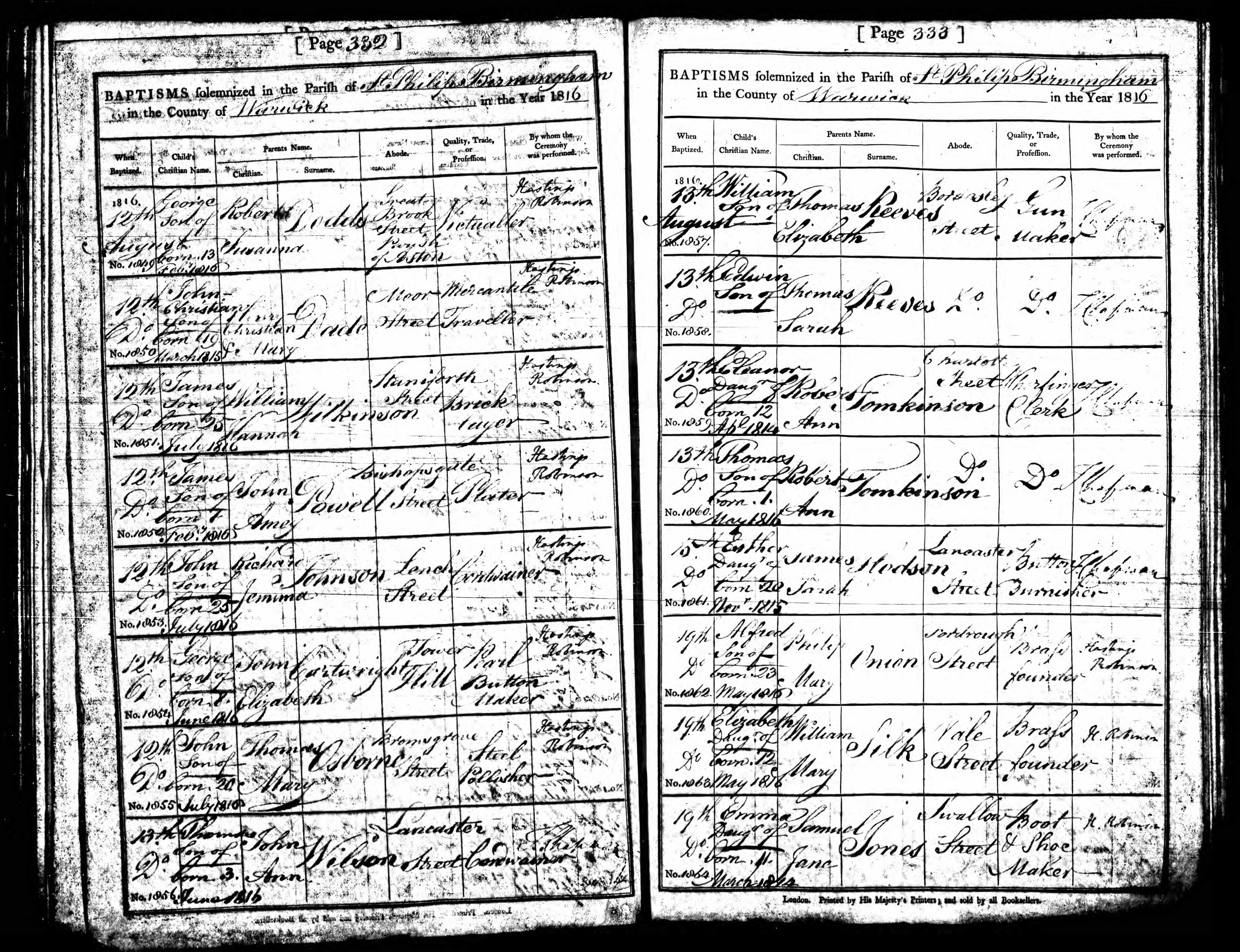 Jane married Samuel JONES from Belfast in Hanover Square, London in 1807 and, after the birth of their first child Mary, they moved to Birmingham, possibly because at that time breaking into the London guild system was difficult and Birmingham had no such restrictions for aspiring master boot makers.